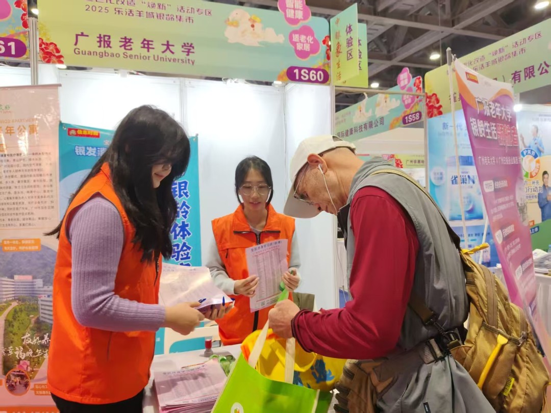 现场除了大量的适老化产品和智能科技产品,老年教育和益智类展位也受到许多长者的关注。设在银龄集市的广报老年大学摊位,价格普惠、种类繁多的课程吸引了不少长者咨询。据了解,广报老年大学由广州日报报业集团携手广州老年大学共同打造,由信息时报具体运营,在全市11区打造“1(旗舰校)+100(社区分教点)+N(共建校区)”的市、区、街、社区四级办学体系。目前,广报老年大学在越秀区东峻广场开设旗舰校区,开设舞蹈、书画、非遗、养生等40余类课程,并积极对接激活商圈各类商户,为长者学员提供定制化、高品质餐饮、娱乐、文旅等全场景银龄消费服务,打造全民“终身学习”的老年大学3.0版本。