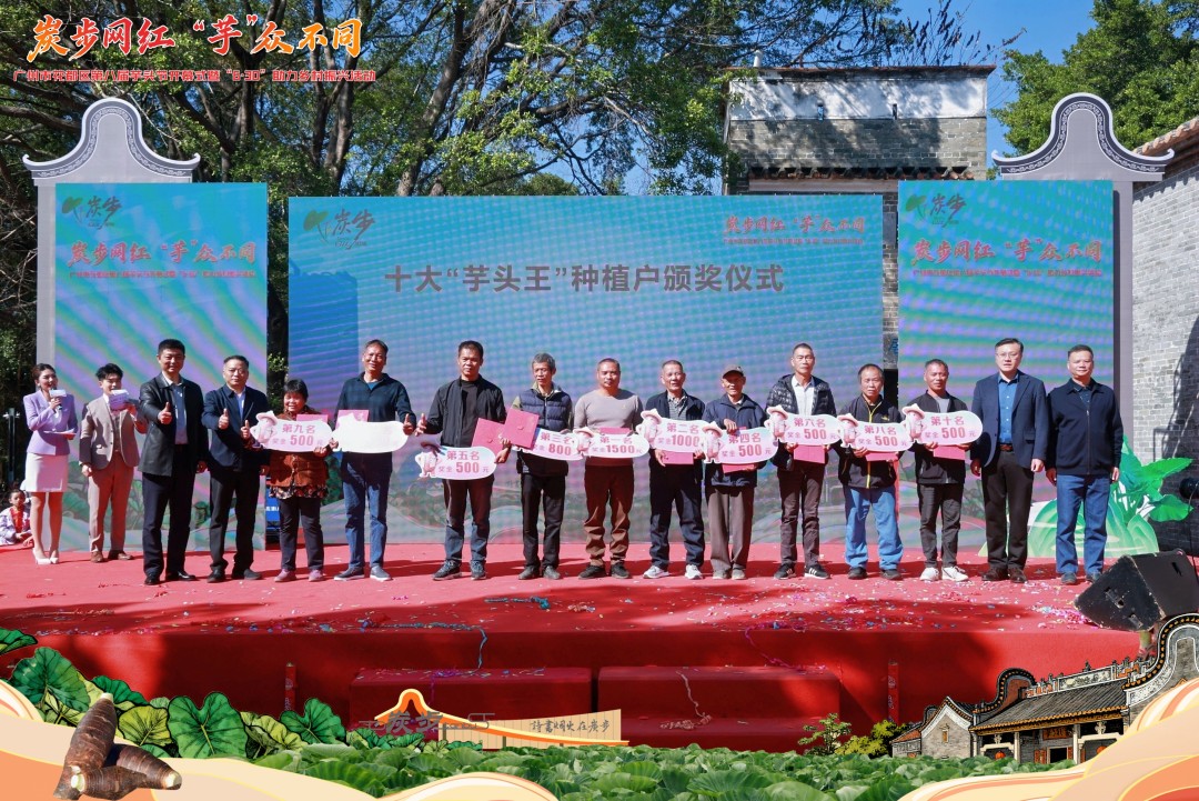 仪式后半段聚焦产业核心,先后为评选出的十大“芋头王”种植户举行颁奖仪式,对他们背后的辛勤耕耘予以表彰。本届“芋头王”种植户分别来自文一村、文二村、唐美村、骆村,夺得头魁的是唐美村庾国俊,其种植的芋头重达10.24斤,文二村谢恩乐种植的芋头以重量9.42斤获得第二名;文一村谭兆礼种植的芋头以重量9.28斤获得第三名。
