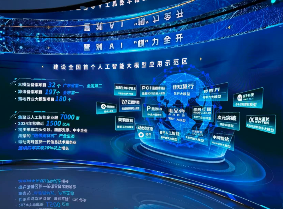 紧扣时代脉搏,琶洲率先抢抓人工智能技术革命和应用落地关键窗口期,谋划实施“人工智能应用+”行动,全力建设全国人工智能应用示范先进区。截至目前,全区共集聚泛人工智能企业超7000家,2024年实现营收近1500亿元,同比增长10.5%。全区已培育大模型备案项目32个,位列全省首位,算法备案项目270个,位列全市首位,落地行业大模型项目达200个,有效带动新一代信息技术服务业连续3年保持20%以上增长。其中,超100家大模型企业实现盈利,预计全年人工智能大模型项目营收将突破100亿元。