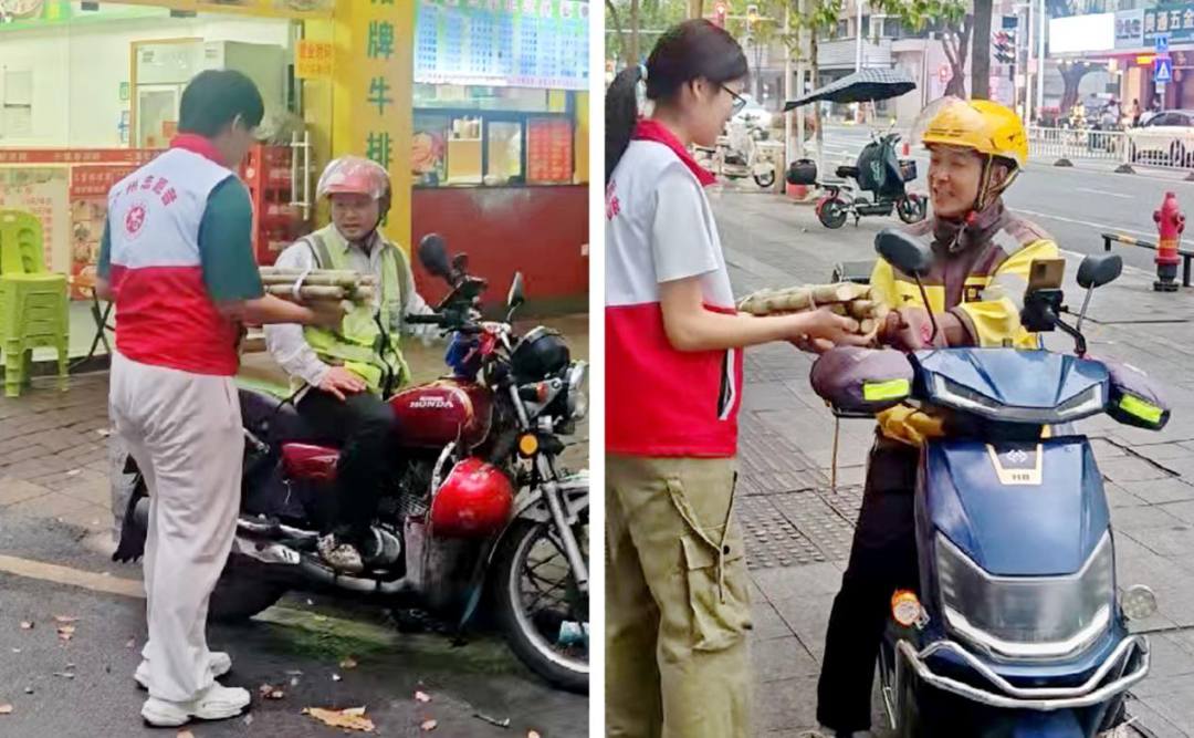 志愿者把甘蔗派送给摩的师傅、外卖小哥。受访者供图